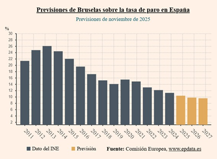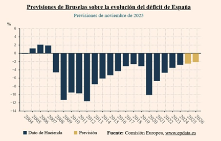 En el último mes, los indicadores macro han reforzado la idea de que España mantiene un ciclo económico sólido pese al contexto europeo. La Comisión Europea revisó al alza sus previsiones y proyecta un crecimiento del 2,9% para 2025, junto con una expansión todavía firme del 2,3% en 2026. A esto se suma una mejora en las cuentas públicas: el déficit esperado cae al 2,5% este año y al 2,1% en 2026.