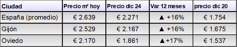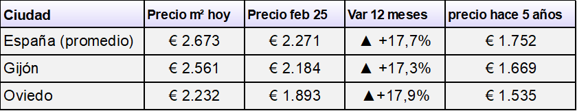 En Asturias, Oviedo llega a 2.160 €/ m² (+17,4%) y Gijon a 2.544 €/ m² (+21,2%)